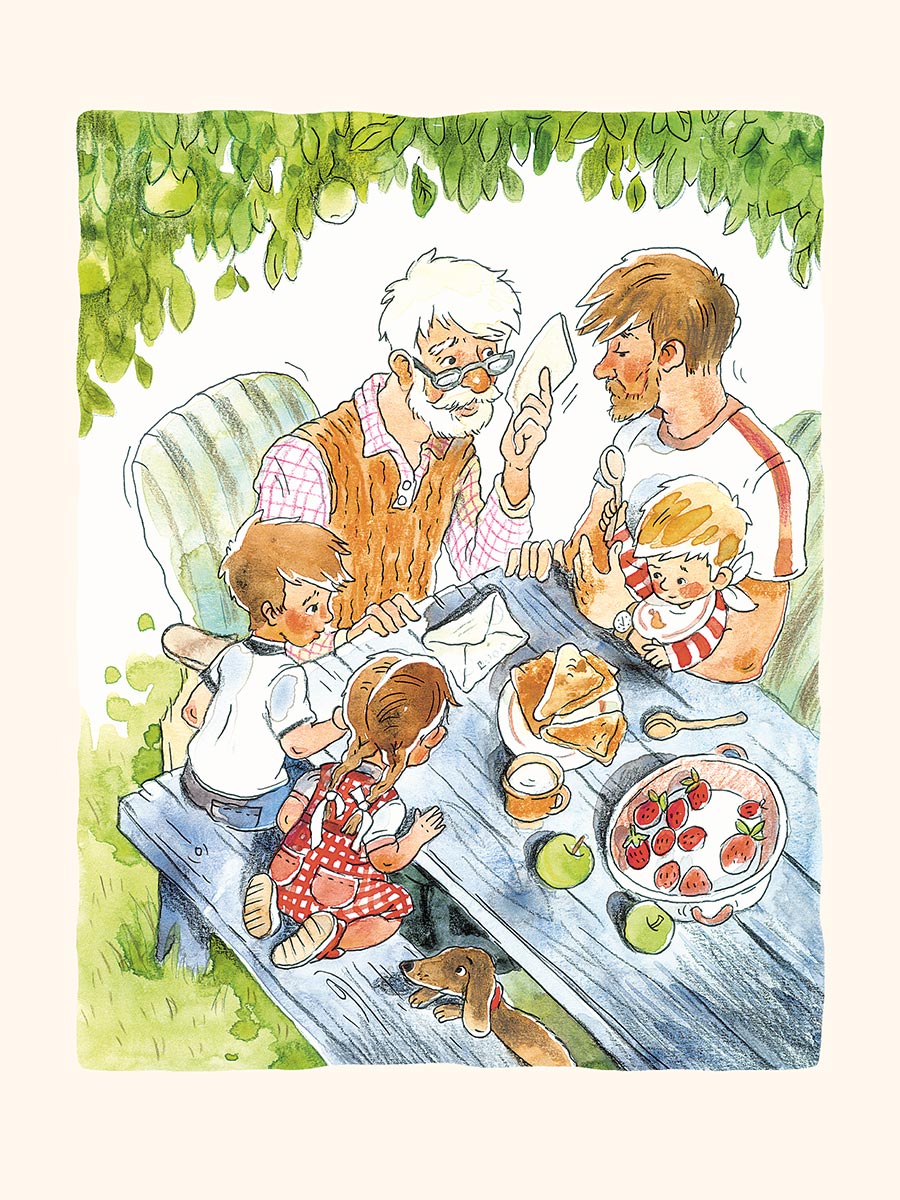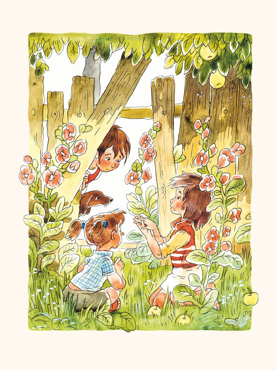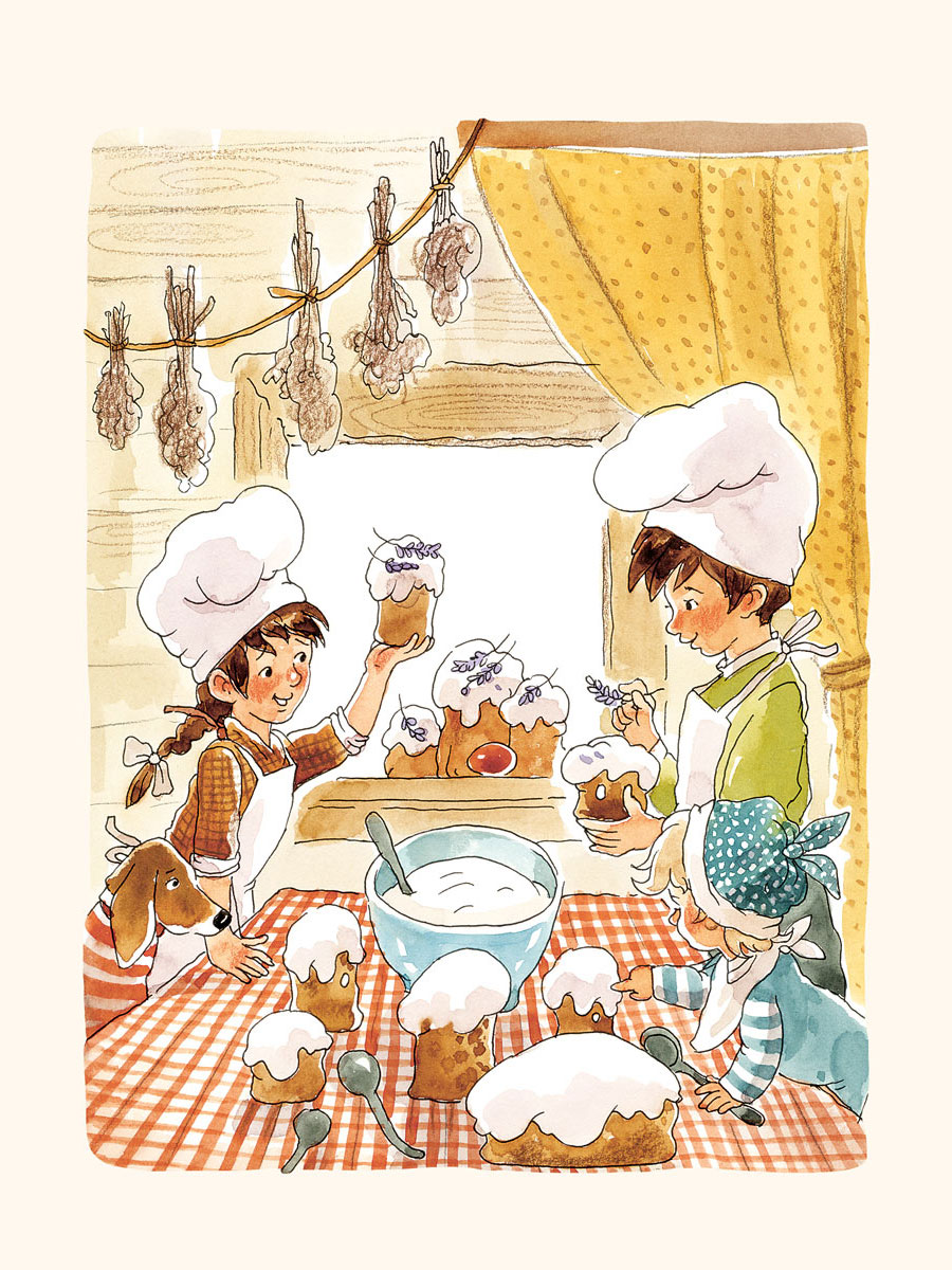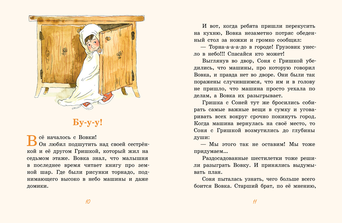«Вдоволь наевшись мороженого, дети попеременно умылись, переоделись в пижамы и прыгнули в свои кровати. Соня включила ночничок, и в детской стало очень уютно. Когда бабушка Валя пришла в комнату, из-под одеял виднелись только три детские рожицы».