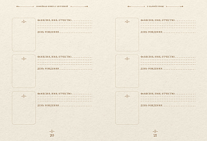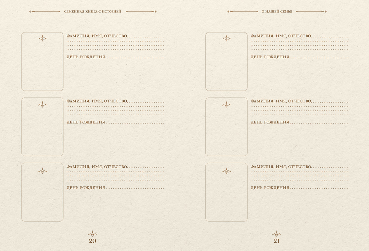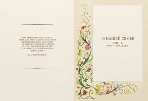 Внутри вы найдёте одиннадцать глав, посвящённых важным аспектам в жизни каждого члена семьи, а также вопросы и пояснения, которые помогут вам при заполнении страниц. Особенную атмосферу домашнего уюта создадут открытки начала прошлого века и изящные старинные орнаменты, которыми украшена книга.